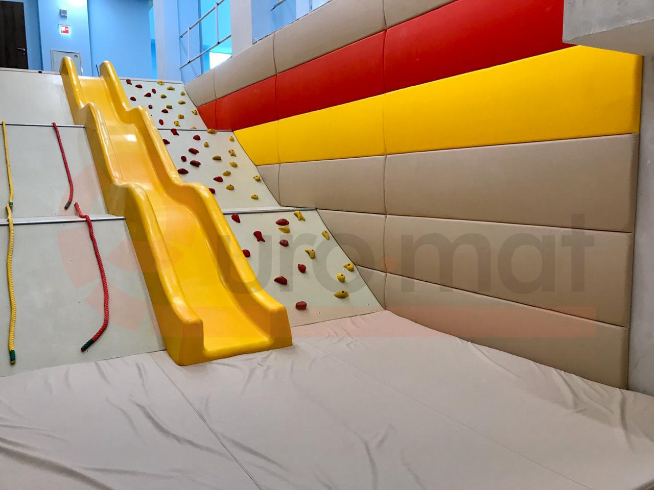 Изготовили и произвели монтаж стеновых протекторов для полосы препятствий между раздевалкой и спортивным залом в виде мини скалодрома.