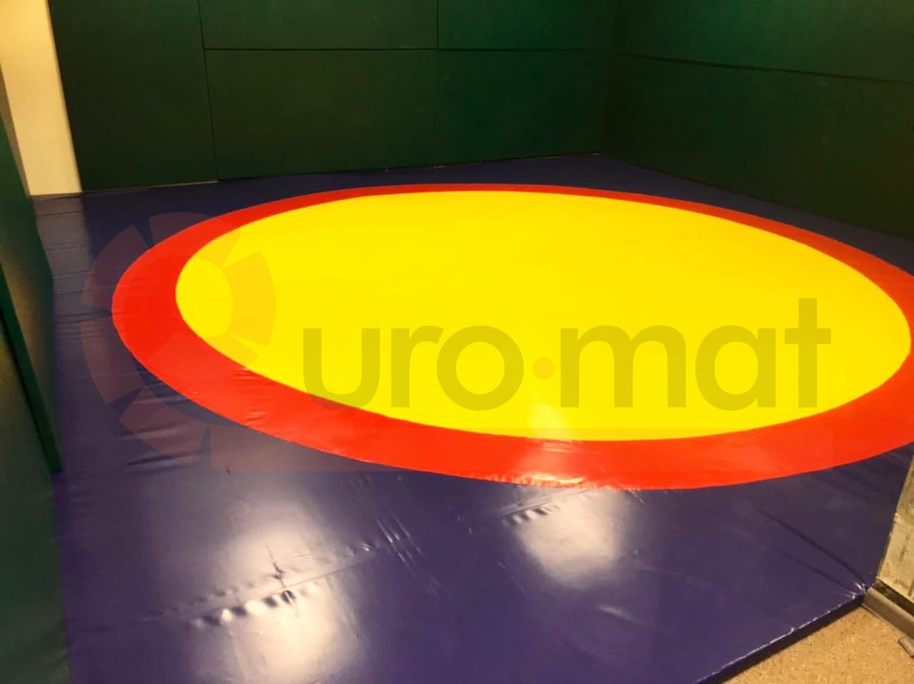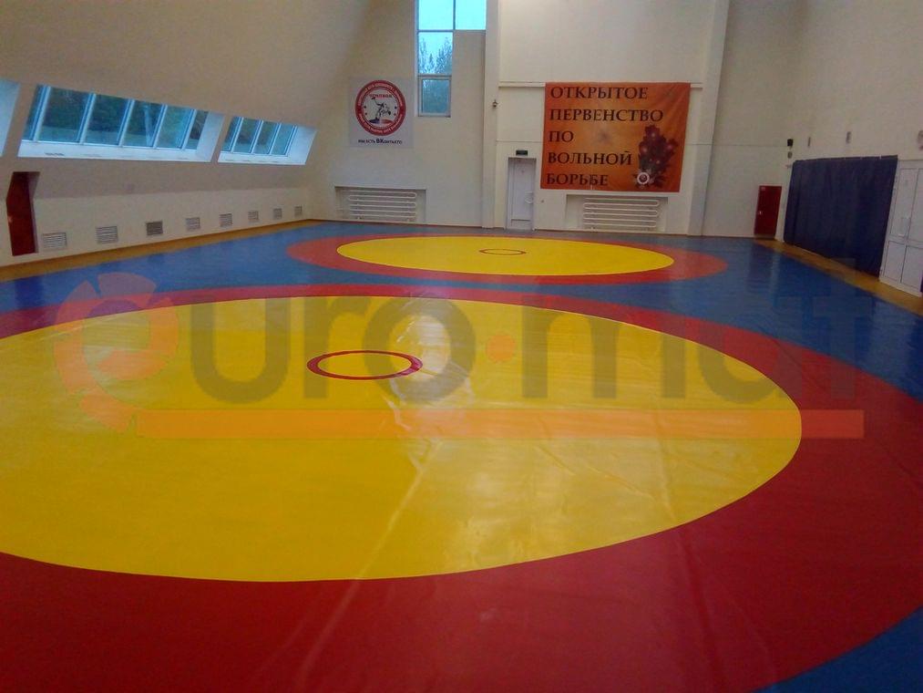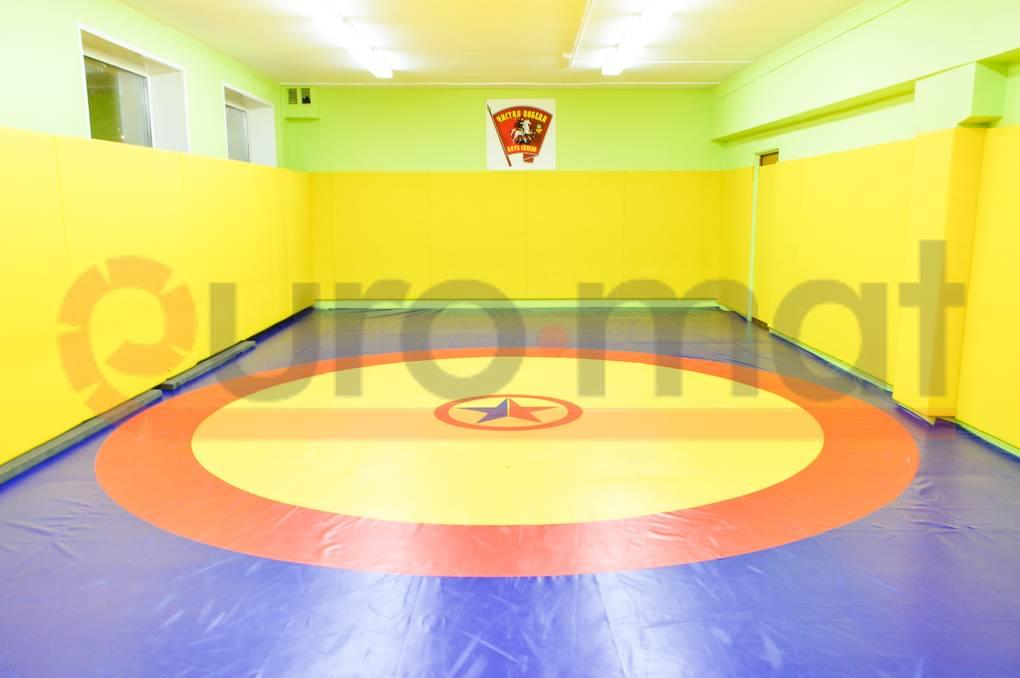 Для нашего клиента изготовили большой борцовский ковер нестандартной формы на 3 зоны борьбы и защитные протекторы из ПВХ на стены и колонны. Ковер 2х цветный, выполнен из глянцевой ПВХ ткани, в качестве основания выбрали стандартные маты из ППЭ 40 мм толщиной.