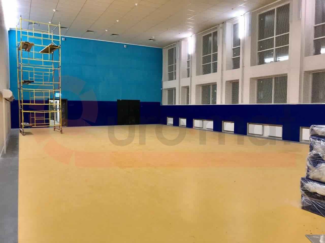 Просто потрясающий объект - новая инженерная школа в Совхозе им. Ленина. Делали борцовский ковер и протекторы в 2 зала: игровой и зал единоборств. Уникальность протекторов в игровом зале заключается в их высоте: протекторы в 5 метров высоты! В зале единоборств мы укладывали борцовский ковер под плинтус и протекторы по кругу.