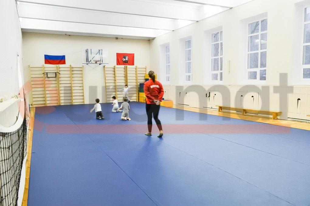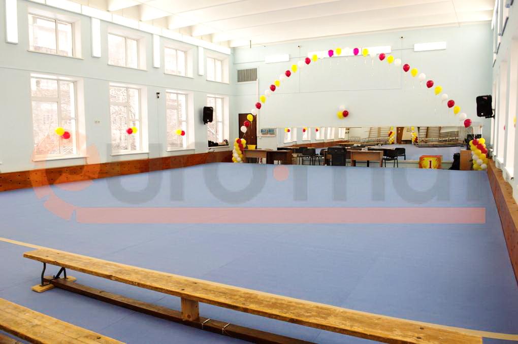 В школе требовались маты, которые можно быстро собрать/разобрать. Лучшим вариантом, конечно же, был ролл-мат. В итоге подготовка к спортивным занятиям занимает 1 минуту, хотя зал универсальный.