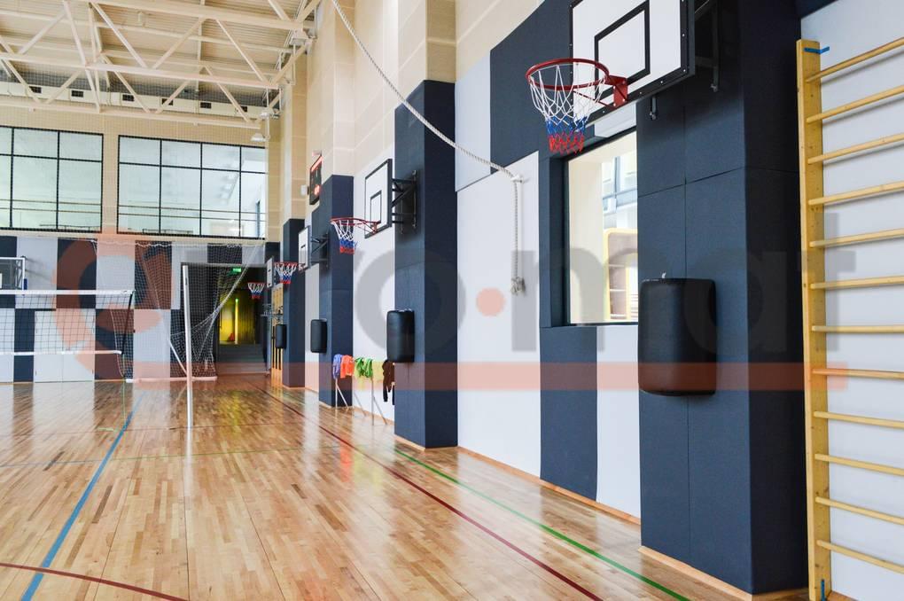 Для новой школы в Москве оборудовали спортивный зал стеновыми протекторами и защитой на радиаторы. Протекторы изготовлены из экокожи в фирменных цветах школы, с мягким амортизирующим наполнителем на твердом основании из ХДФ. В соответствии с требования в учебных заведениях протекторы должны быть съемные. Поэтому оптимальным решением было использовать крепление протекторов на стены и колонны при помощи липучки. Для радиаторов отопления изготовили по размеру специальные металлические каркасы, на которые крепятся протекторы.